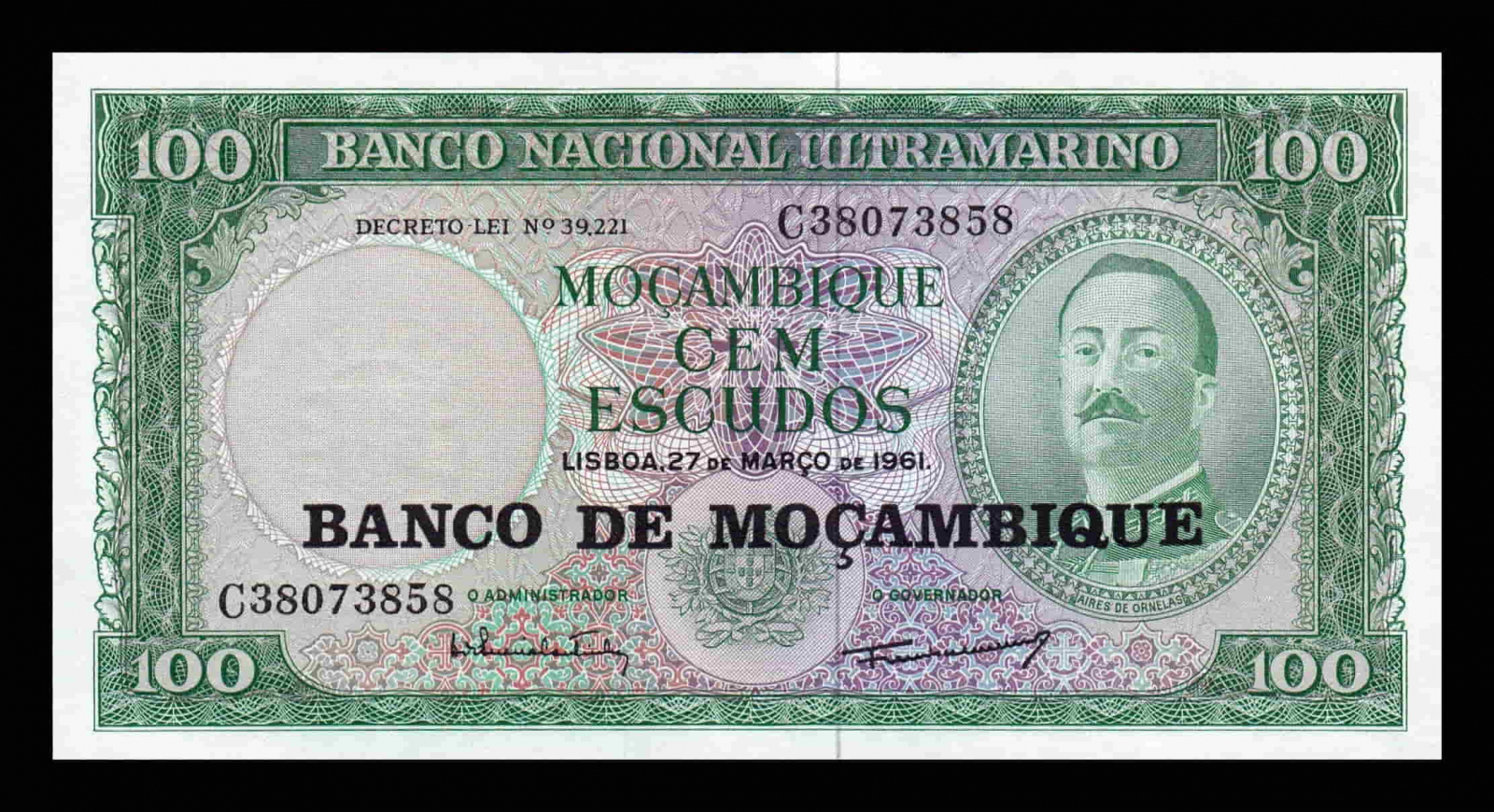 Mozambic 100 Escudos 1961, g-ral Aires de Ornelas, necirculata
