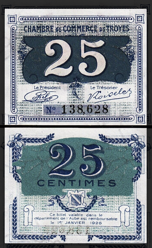 Franta - Troyes - 25 Centimes 1926, necirculata, cu filigran
