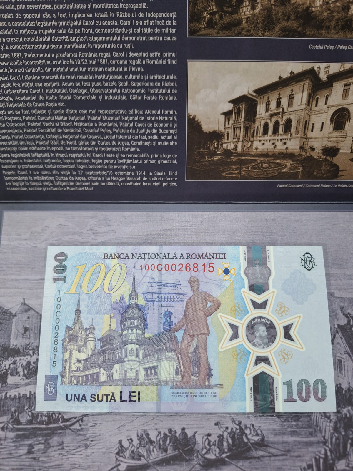 Bancnota aniversară pentru colecționare, cu valoare nominală de 100 lei, cu tema 185 de ani de la nașterea regelui Carol I este inclusă într-un pliant de prezentare al cărui text este redactat în limbile română, engleză și franceză.