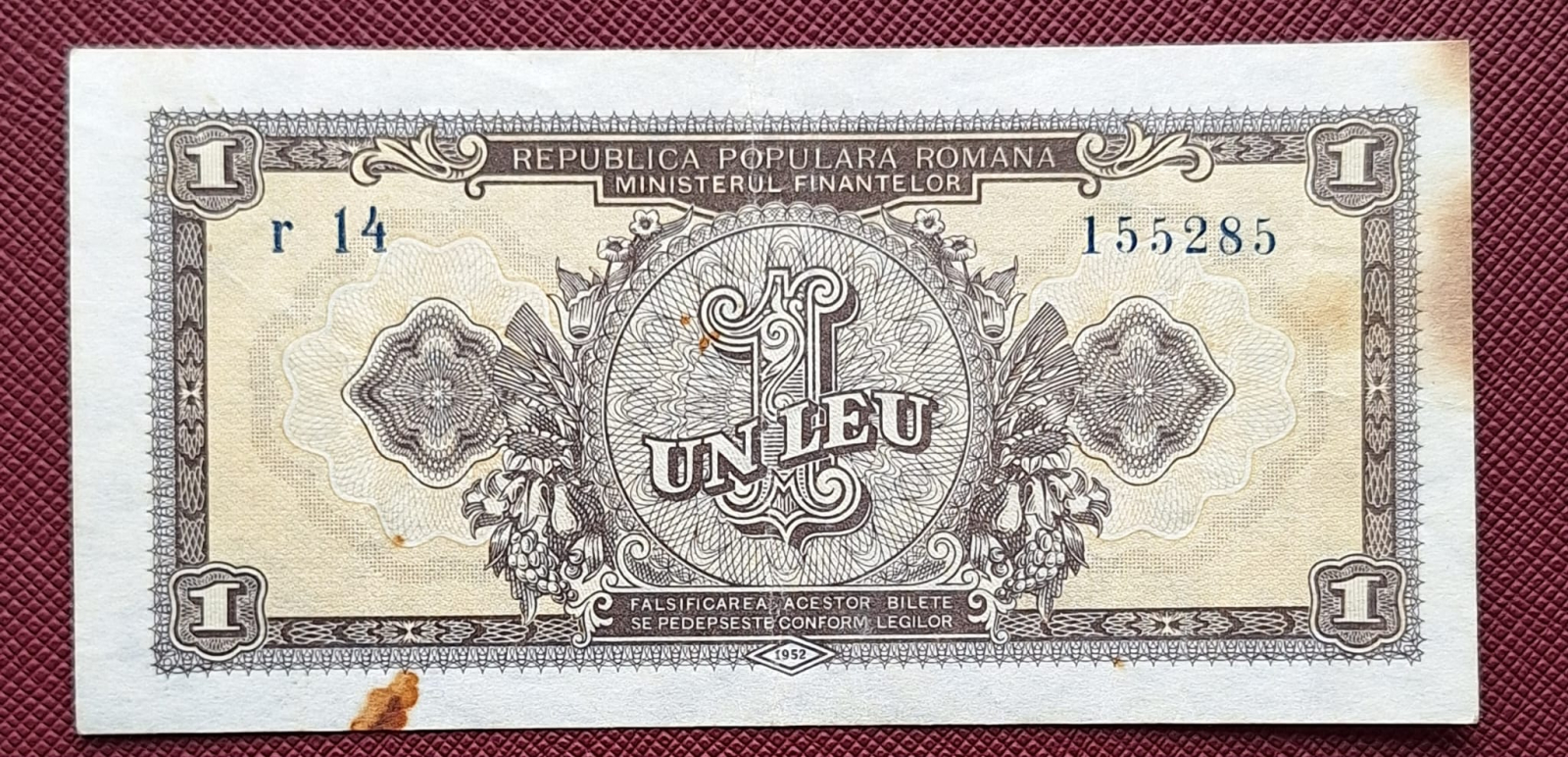 Romania, 1 leu 1952, seria r 14 / 155285, circulata, stare buna
