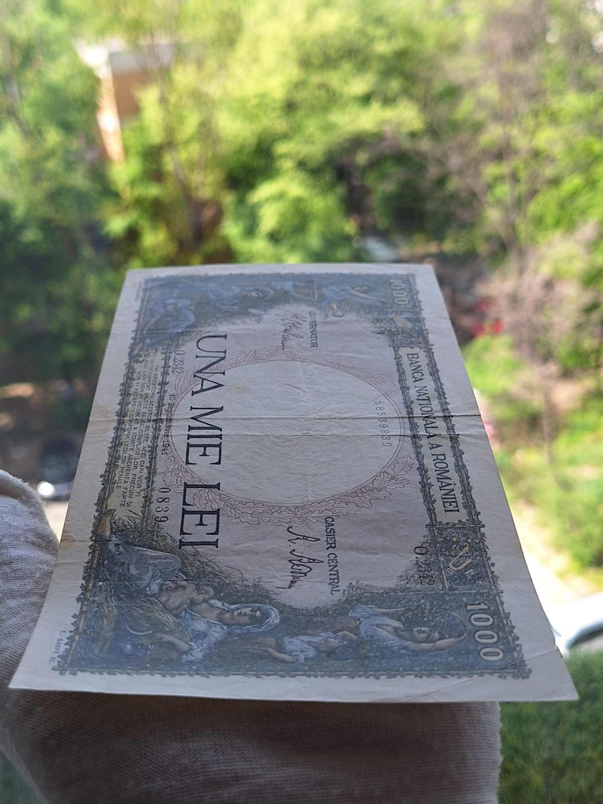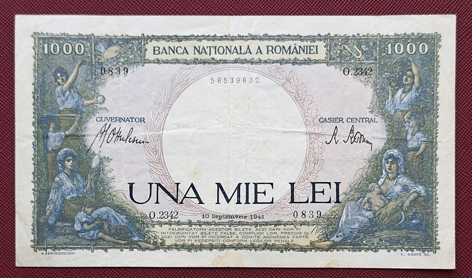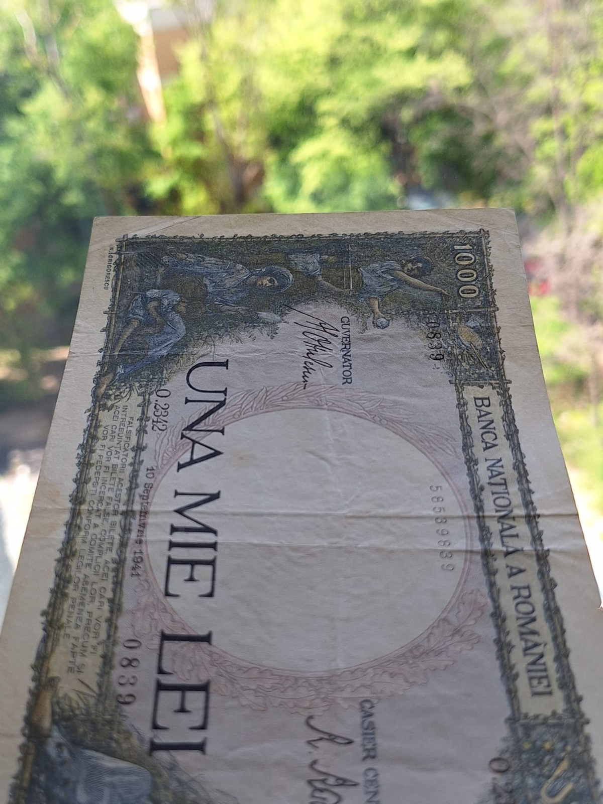 Romania, 1000 lei 1941, seria O.2342/0839/58539839, circulata