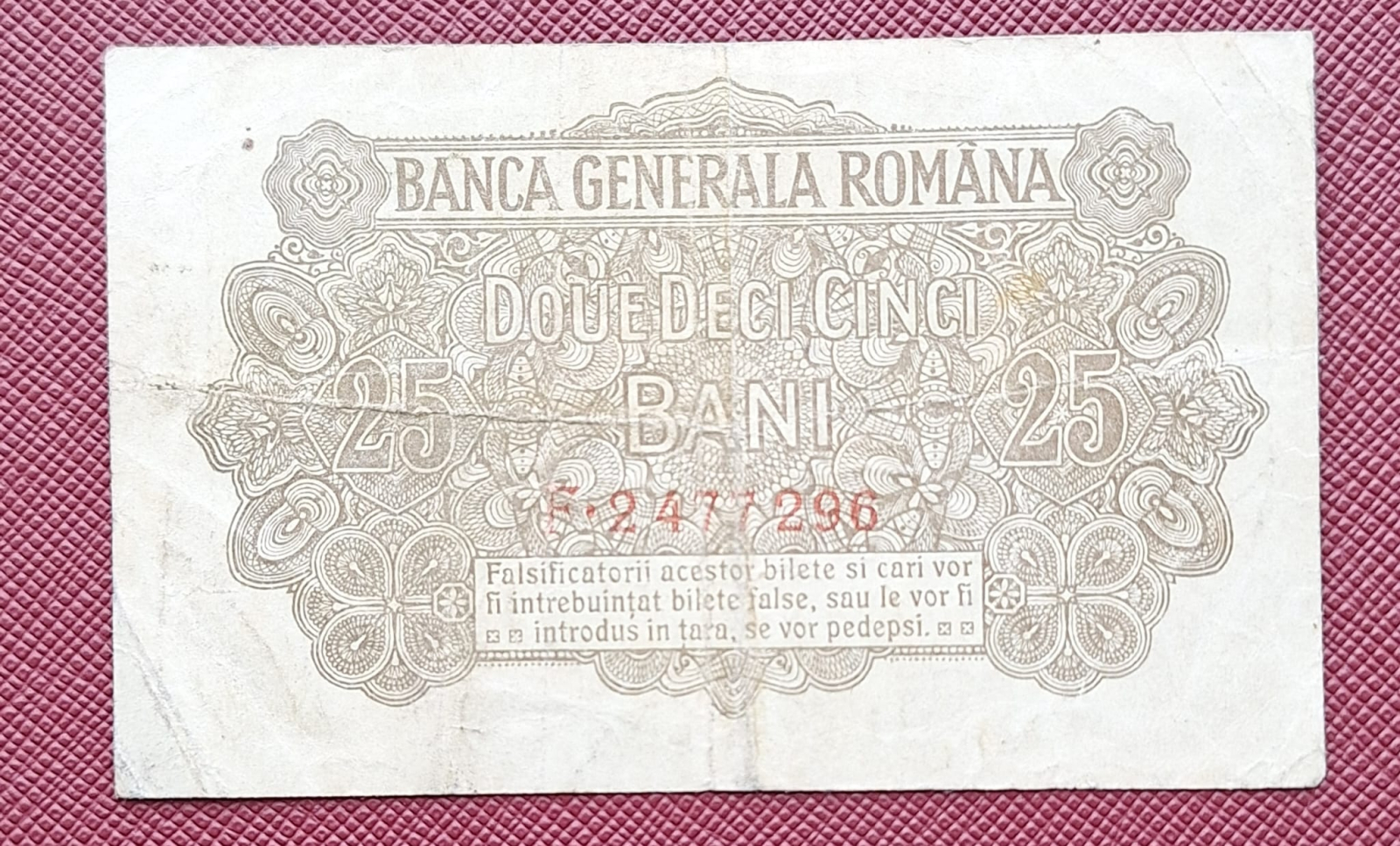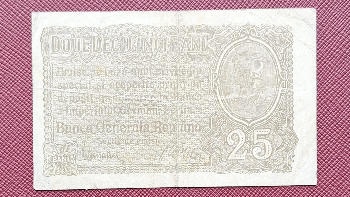 Romania 25 Bani 1917 B.G.R, Ocupatia Germana, seria F.2477296, circulata