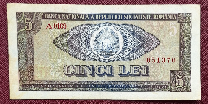 Romania 5 lei 1966, seria A.0169/051370, circulata, stare buna