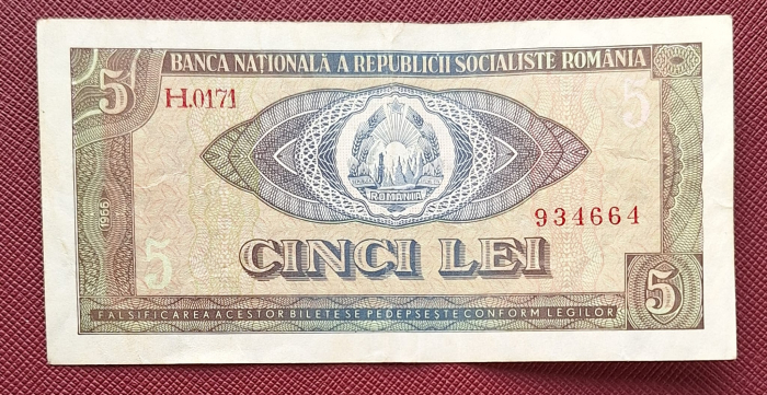 Romania 5 lei 1966, seria H.0171/934664, circulata