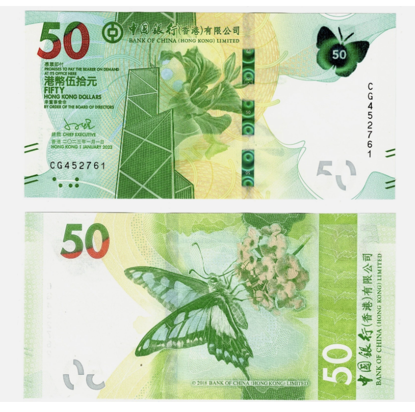Hong Kong 50 Dolari 2023, Banca Chinei, Orhidee si fluture, UNC