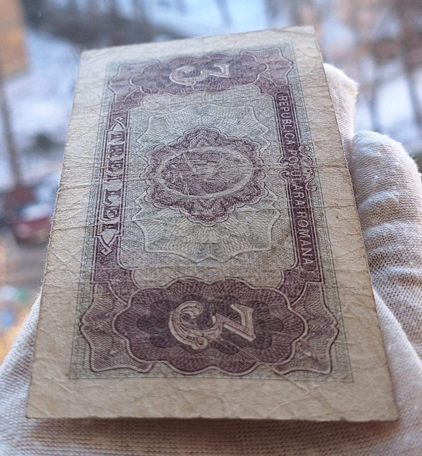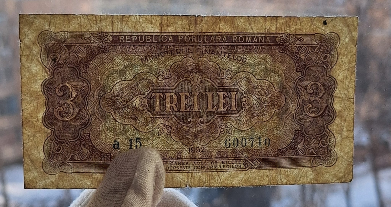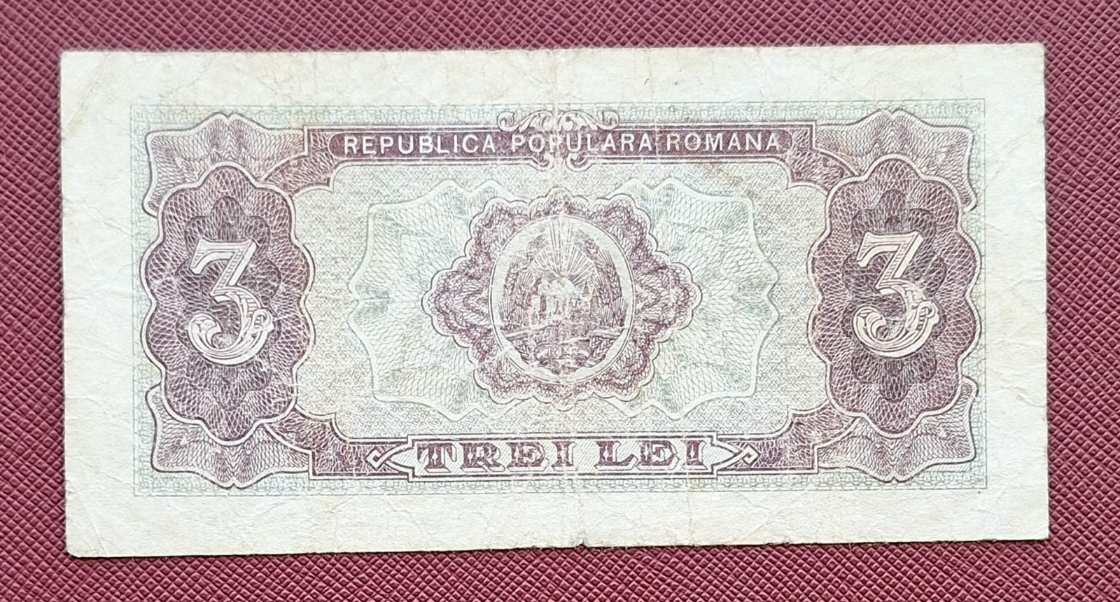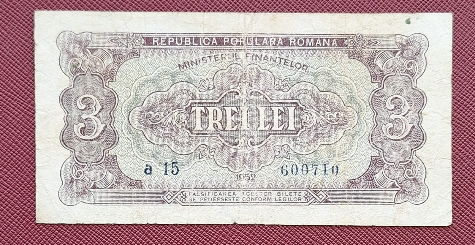 Romania, 3 lei 1952, seria a 15 / 600710, circulata