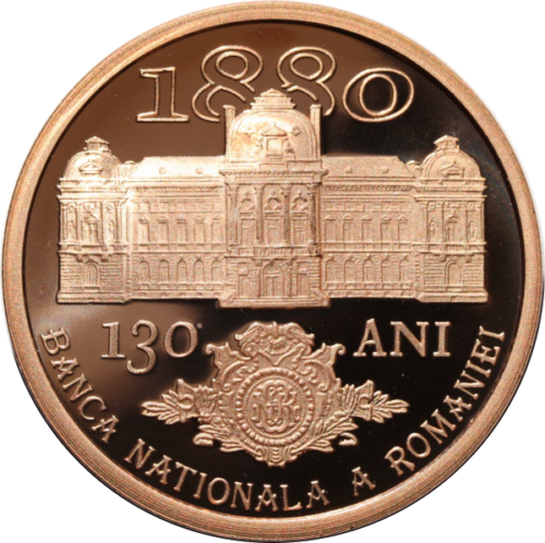 Revers - Anul înfiinţării băncii centrale „1880”, imaginea Palatului vechi al Băncii Naţionale a României, sigla BNR într-un scut ornamentat încadrată de inscripţia „130 ANI” şi inscripţia semicirculară „BANCA NATIONALA A ROMANIEI”.