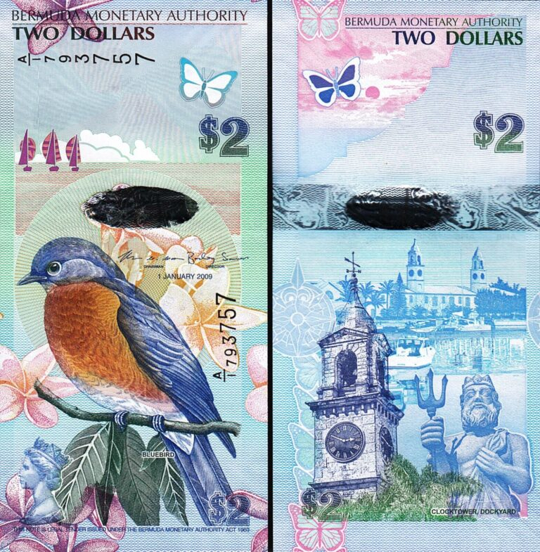 Insulele Bermude 2 Dolari 2009, pasarea albastra, bancnota Hybrid, Aunc