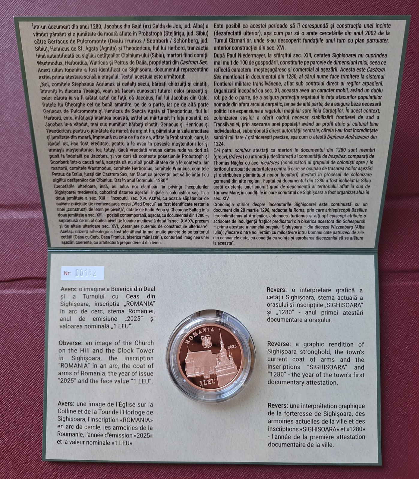 Aversul monedei din tombac cuprat prezintă o imagine a Bisericii din Deal și a Turnului cu Ceas din Sighișoara, inscripția „ROMANIA” în arc de cerc, stema României, anul de emisiune „2025” și valoarea nominală „1 LEU”.
