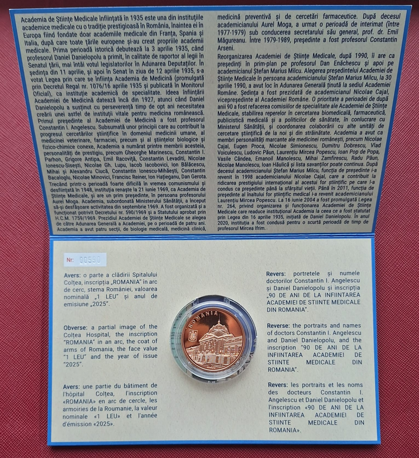 Aversul monedei prezintă o parte a clădirii Spitalului Colțea, inscripția „ROMANIA” în arc de cerc, stema României, valoarea nominală „1 LEU” și anul de emisiune „2025”.