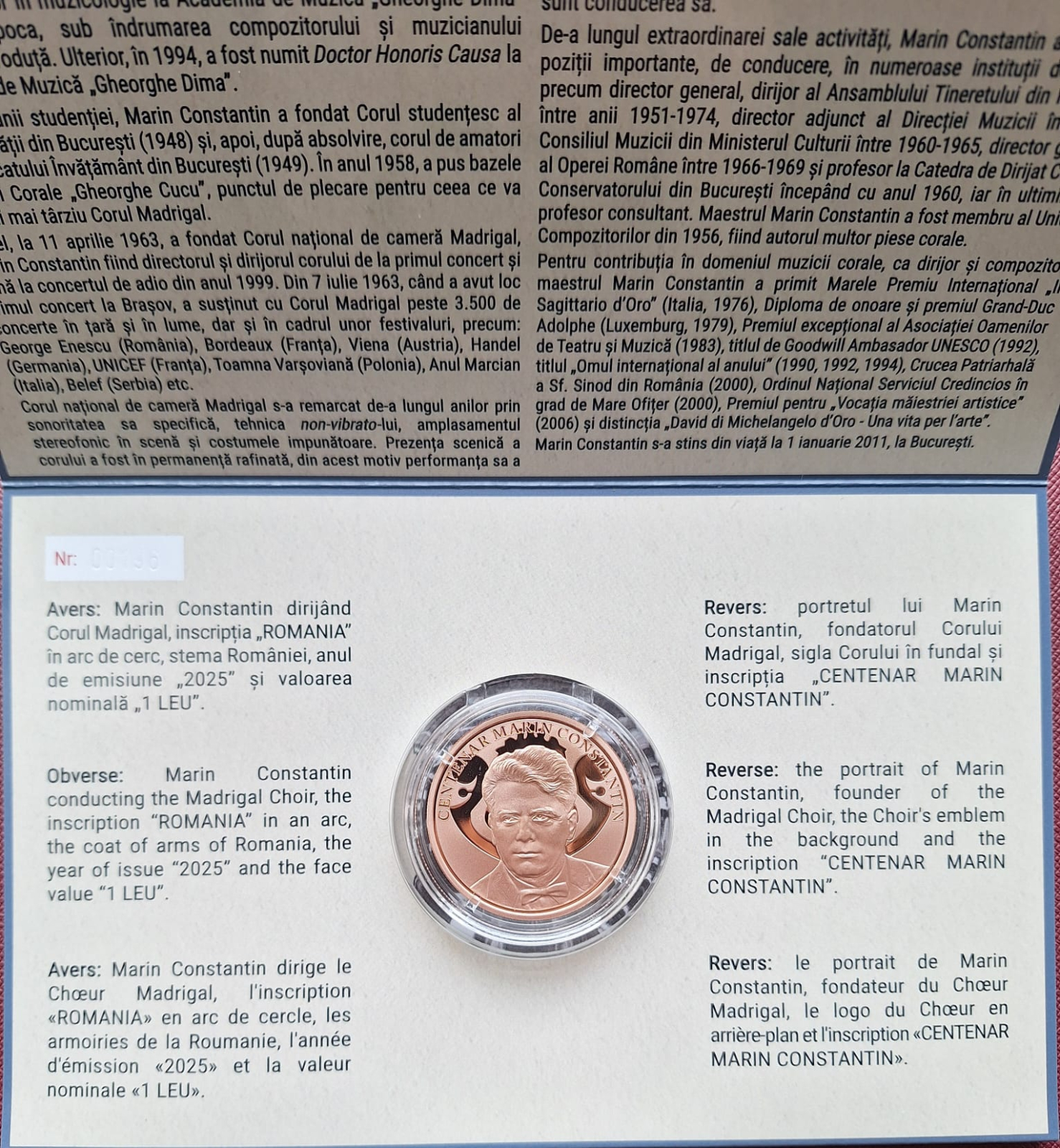 Aversul monedei îl prezintă pe Marin Constantin dirijând Corul Madrigal, inscripția ''ROMANIA'' în arc de cerc, stema României, anul de emisiune ''2025'' și valoarea nominală ''1 LEU''.
