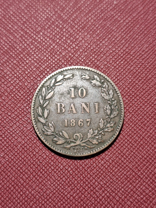 | Descriere revers | Valoarea nominală 10 BANI si anul emiterii 1867 într-o cunună formată dintr-o ramură de laur (stanga) şi una de stejar (dreapta) iar sub panglica ce leagă cele două ramuri se află numele monetăriei ..Watt & Co |