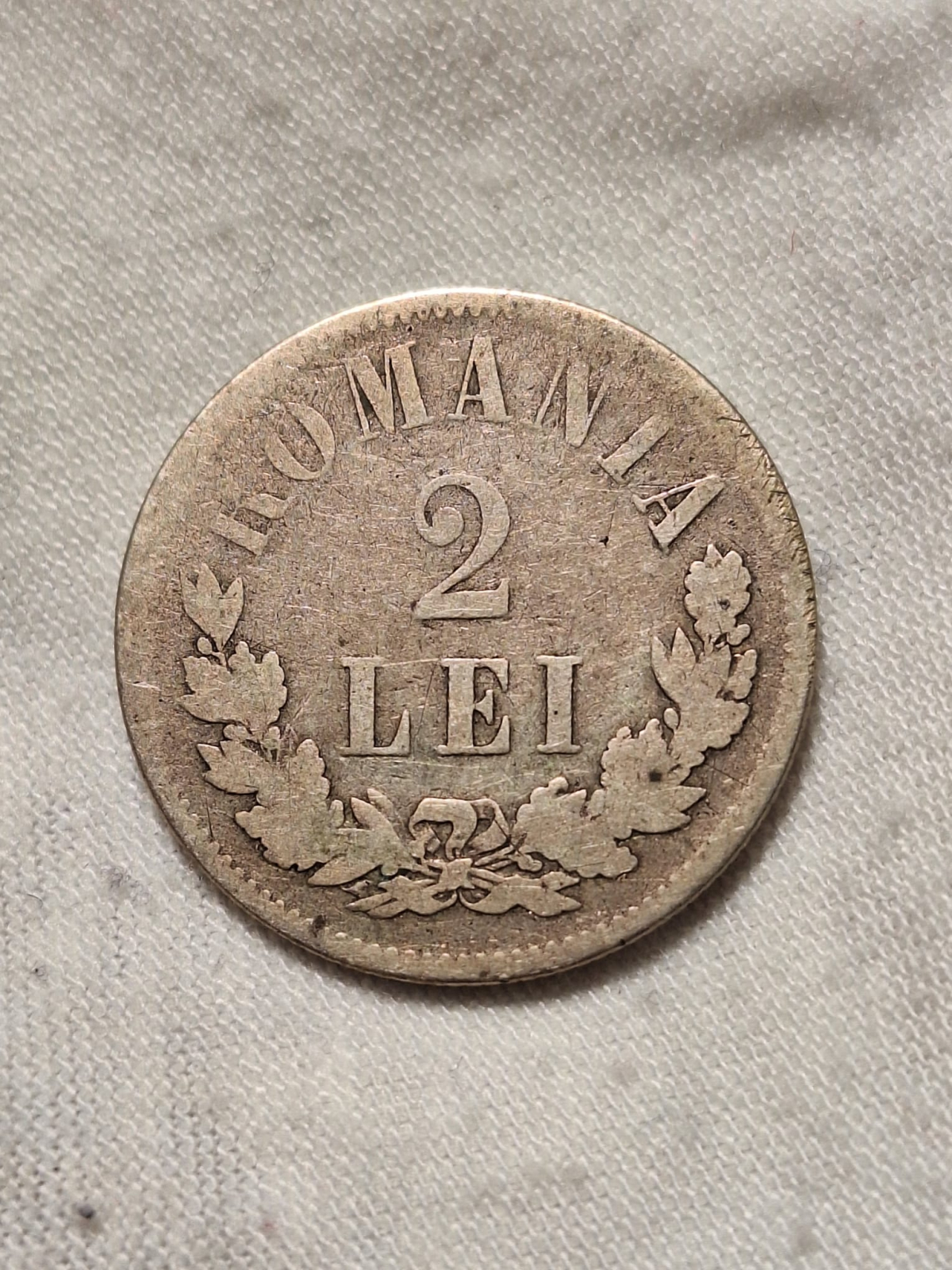 Descriere avers ROMANIA, valoarea nominală 2 LEI, cunună împletită din ramuri de laur şi de stejar, cerc perlat exterior