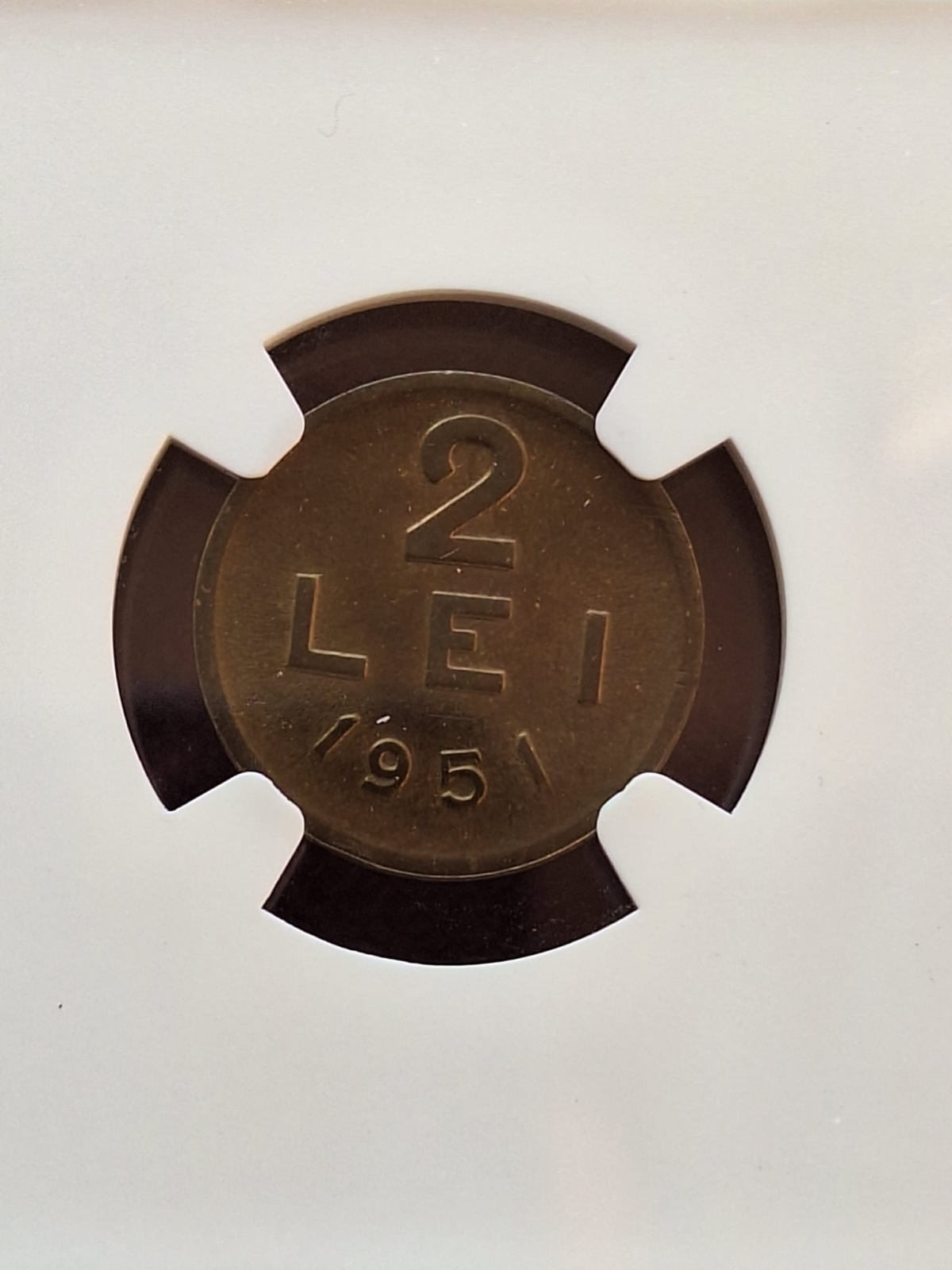 Romania, moneda 2 lei 1951 alama, gradat NGC Cleaned, cu batere dubla