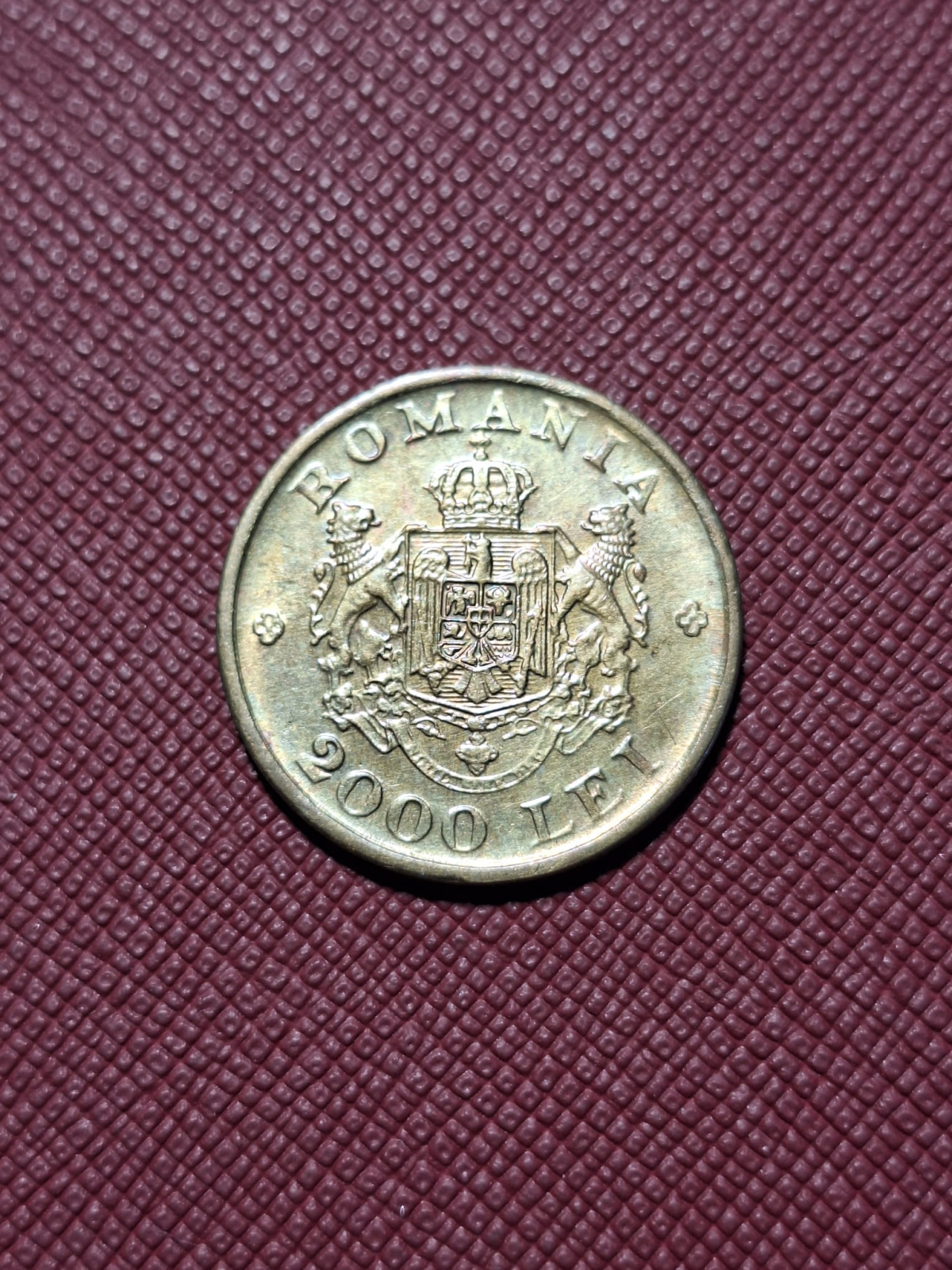 Descriere avers valoarea nominală 2000 LEI, ROMANIA, stema României, la stînga şi la dreapta cîte o cruce în formă de floare