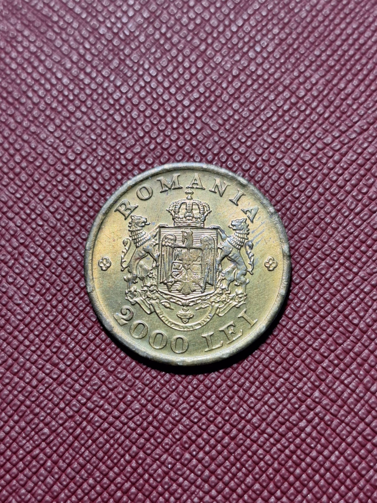 Descriere avers valoarea nominală 2000 LEI, ROMANIA, stema României, la stînga şi la dreapta cîte o cruce în formă de floare