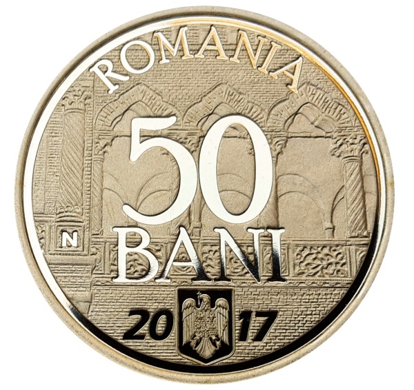 Avers - O compoziție care conține detalii arhitecturale ale stilului brâncovenesc, inscripţia în arc de cerc „ROMANIA”, valoarea nominală „50 BANI”, stema României și anul de emisiune „2017”. În interiorul bazei primei coloane din stânga este inscripţionată litera „N”, ca semn distinctiv al piesei pentru colecţionare. Margine inscripționată cu ,,ROMANIA” de două ori, cu steluță între cele două cuvinte.