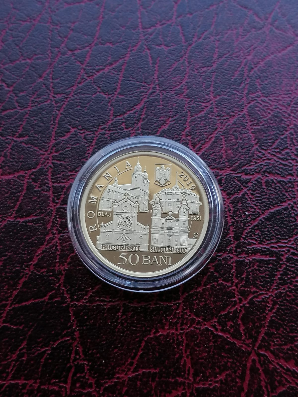 Avers - Imagini ale unor lăcașuri de cult și numele localităților unde se află acestea, respectiv Catedrala Sfântul Iosif - ,,BUCURESTI”, Sanctuarul marian - ,,SUMULEU CIUC”, Catedrala Sfânta Treime - ,,BLAJ”, Catedrala Sfânta Fecioară Maria, Regină - ,,IASI”, care au fost vizitate de Sanctitatea Sa Papa Francisc, inscripțiile în arc de cerc „ROMANIA” și anul de emisiune „2019”, stema României și valoarea nominală „50 BANI”.